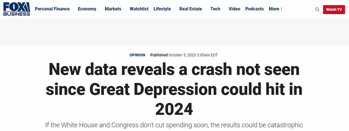 報道中寫道,越來越多的數(shù)據(jù)表明,一場破壞性超過大蕭條的經(jīng)濟崩盤可能即將在2024年降臨美國。白宮和國會如果不盡快削減政府支出,結(jié)果可能是災難性的。