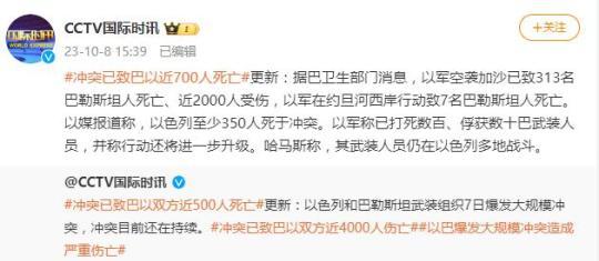 央視網(wǎng)消息:據(jù)CCTV國際時(shí)訊微博消息,據(jù)巴衛(wèi)生部門消息,以軍空襲加沙已致313名巴勒斯坦人死亡、近2000人受傷,以軍在約旦河西岸行動(dòng)致7名巴勒斯坦人死亡。以媒報(bào)道稱,以色列至少350人死于沖突。以軍稱已打死數(shù)百、俘獲數(shù)十巴武裝人員,并稱行動(dòng)還將進(jìn)一步升級(jí)。哈馬斯稱,其武裝人員仍在以色列多地戰(zhàn)斗。