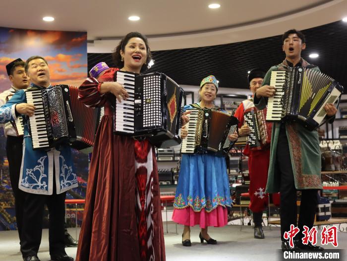 近日,記者走進(jìn)伊寧市六星街,由錫伯族、哈薩克族、俄羅斯族、漢族、維吾爾族等音樂愛好者組成的手風(fēng)琴樂隊正在表演。 中新社記者 薄雯雯 攝