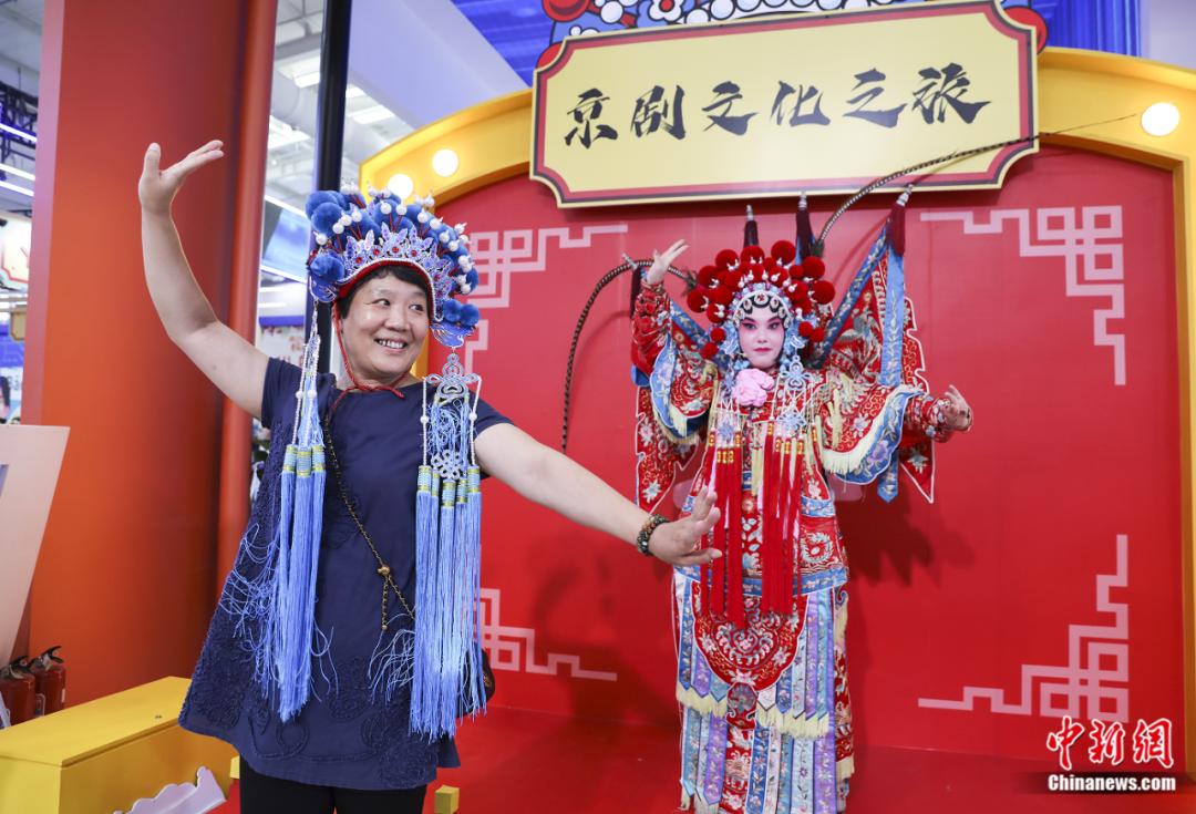 2023年中國國際服務(wù)貿(mào)易交易會(huì)(服貿(mào)會(huì))在北京舉行,觀眾在首鋼園區(qū)“京劇文化之旅”展臺(tái)模仿京劇演員表演《穆桂英》片段。趙雋 攝