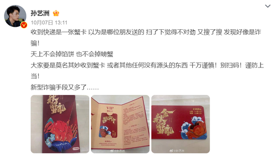 10月7日,知名男演員孫藝洲發(fā)文稱,快遞收到一張蟹卡,搜索后發(fā)現(xiàn)是詐騙,提醒網(wǎng)友謹防上當。其發(fā)文登上熱搜后,不少網(wǎng)友都表示收到過類似蟹卡。