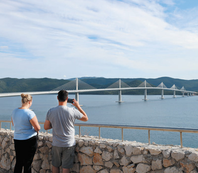 沿著克羅地亞狹長(zhǎng)的海岸線一路向南行駛到科馬爾納地區(qū),遠(yuǎn)遠(yuǎn)就能望見如銀鏈般橫臥在山海之間的佩列沙茨大橋。在橋頭一側(cè)的休息區(qū),人們紛紛停下車來,對(duì)著大橋拍照留念。來自克羅地亞北部的卡塞爾和朋友們特地自駕來到這里,開心地請(qǐng)本報(bào)記者幫忙合影?!芭辶猩炒拇髽蜻B通了克羅地亞南北領(lǐng)土,是我們心中最美的大橋!”卡塞爾說。
