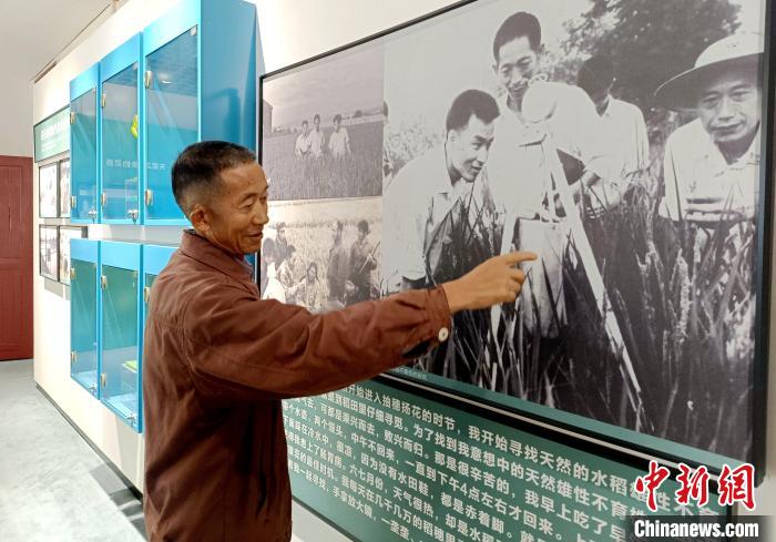 10月13日,在安江農(nóng)校紀念園內的雜交水稻發(fā)源地紀念館,袁隆平的學生宋澤觀講述袁隆平及其團隊研究雜交水稻的故事。中新社記者 鄧霞 攝