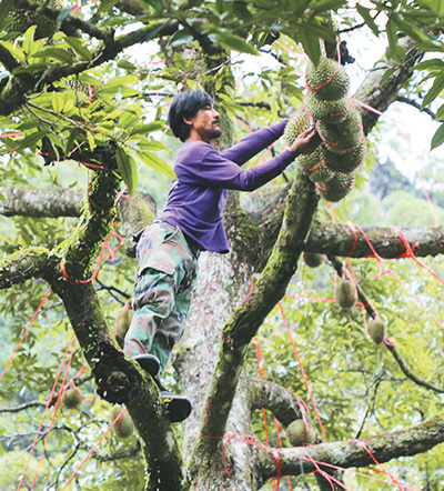 猜瓦家的果園在山坳里,記者乘車從春蓬府直轄縣駛出30公里后,從省際公路拐入狹窄的山間道路,行駛半個小時后才來到果園,一大片榴蓮樹分布在斜坡上。“榴蓮喜水但不耐澇,所以斜坡上最好,這里距離海邊不遠,保證了濕潤的氣候,山里的土壤營養(yǎng)成分高,所以種植的榴蓮肉質(zhì)上乘?!辈峦吲d致勃勃地介紹起自家的果園。
