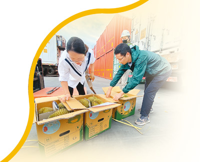核查貨證、抽樣開箱、剖果檢查……黃中磊和同事劉奇開始按流程查驗?!皺z查病媒及有害生物,未見異常;檢查包裝,未見異常;核對品名,未見異常;檢查標簽標識,未見異?!苯?jīng)過認真查驗,兩人確認這批榴蓮查驗合格,可以出證放行。