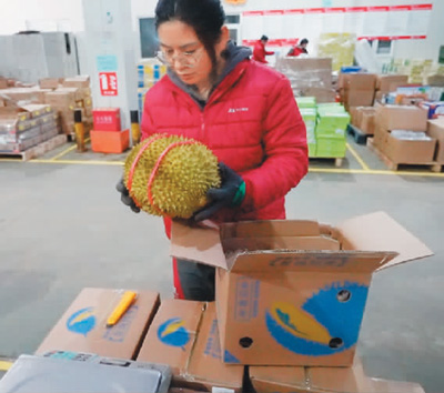 在云南陸航物流服務有限公司貨場,工作人員查看榴蓮狀態(tài)。