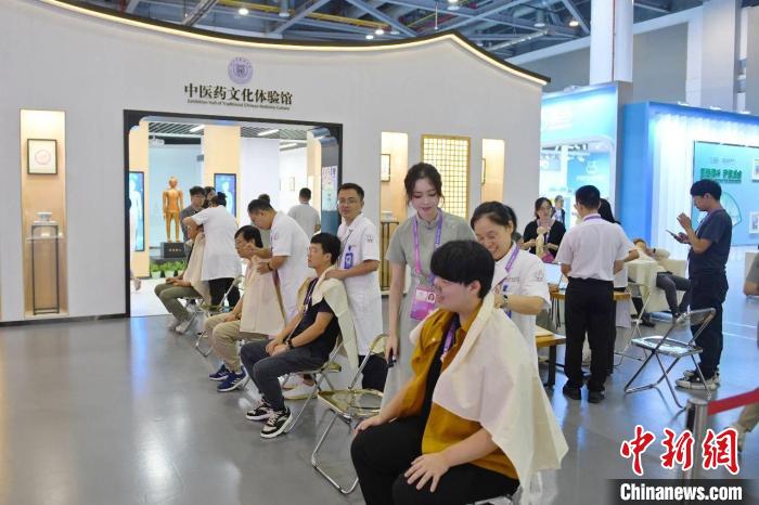 浙江省中山醫(yī)院的推拿團(tuán)隊(duì)在中醫(yī)藥文化體驗(yàn)館服務(wù)中外媒體。浙江省中山醫(yī)院供圖