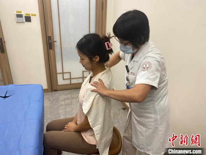 接下來許麗用手微微握拳,在記者左邊肩頸處反復(fù)做著“來回滾動”的動作?!斑@叫‘?法’,可以充分放松肌肉,它是一種柔和有力、剛?cè)岵?jì)的中醫(yī)推拿代表性手法?!痹S麗說,記者群體中,肩頸疼痛是最普遍的問題。“高強(qiáng)度的工作會讓記者常感到頭暈、肩背酸脹,這時(shí)需要一定的肌肉放松才能消除不適感?!?/p>