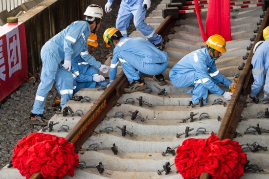 3月31日,在印度尼西亞雅加達(dá)雅萬(wàn)高鐵哈利姆車站,工人鋪設(shè)雅萬(wàn)高鐵全線最后一根鋼軌。