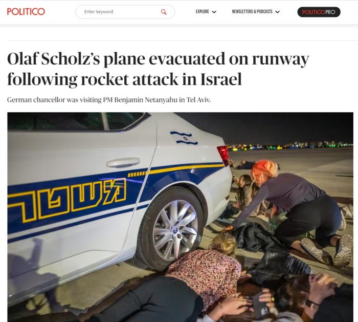 當(dāng)?shù)貢r(shí)間17日晚,德國(guó)總理朔爾茨在以色列本古里安機(jī)場(chǎng)登機(jī)前突遇火箭彈襲擊,人員緊急躲避。圖片來源:美國(guó)政治新聞網(wǎng)報(bào)道截圖