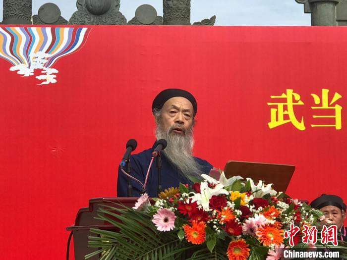 10月21日,武當山紫霄宮方丈升座暨癸卯(2023)年全真派道士傳戒活動典禮在湖北省丹江口市靜樂宮舉行。中國道教協(xié)會會長李光富道長升座武當山紫霄宮方丈。圖為李光富致答謝辭。中新網(wǎng)記者 陳建新 攝