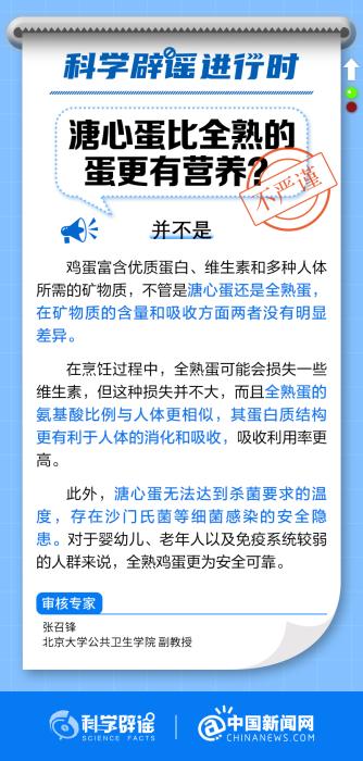 中新網(wǎng)10月20日電 溏心蛋和全熟蛋在礦物質(zhì)的含量和吸收方面沒(méi)有明顯差異。在烹飪過(guò)程中,全熟蛋可能會(huì)損失一些維生素,但這種損失并不大,而且全熟蛋的氨基酸比例與人體更相似,其蛋白質(zhì)結(jié)構(gòu)更有利于人體的消化和吸收。此外,溏心蛋無(wú)法達(dá)到殺菌要求的溫度,存在沙門氏菌等細(xì)菌感染的安全隱患。(來(lái)源:@科學(xué)辟謠 @中國(guó)新聞網(wǎng) )