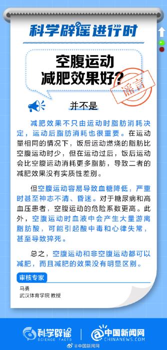 中新網(wǎng)10月24日電 空腹運動和非空腹運動都可以減肥,且減肥的效果沒有明顯區(qū)別。但空腹運動容易導致血糖降低,嚴重時會造成神志不清、昏迷。對于糖尿病和高血壓患者,空腹運動的危險系數(shù)更高。此外,空腹運動時血液中會產(chǎn)生大量游離脂肪酸,可能引起酸中毒和心律失常,甚至導致猝死。(來源:@科學辟謠 @中國新聞網(wǎng) )