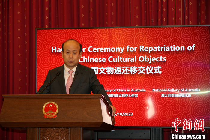 當(dāng)?shù)貢r(shí)間10月25日上午,經(jīng)中國(guó)國(guó)家文物局授權(quán),中國(guó)駐澳大利亞大使館在堪培拉舉行儀式,接收澳方向中國(guó)返還共4件流失文物藝術(shù)品與1件古生物化石。中國(guó)駐澳大利亞大使肖千在致辭中表示,這些文物回歸祖國(guó),顯示了中澳兩國(guó)政府對(duì)于保護(hù)文化遺產(chǎn)的共同承諾,是雙方文化遺產(chǎn)交流的一次盛事和友好合作的見證。 中新社記者 顧時(shí)宏 攝