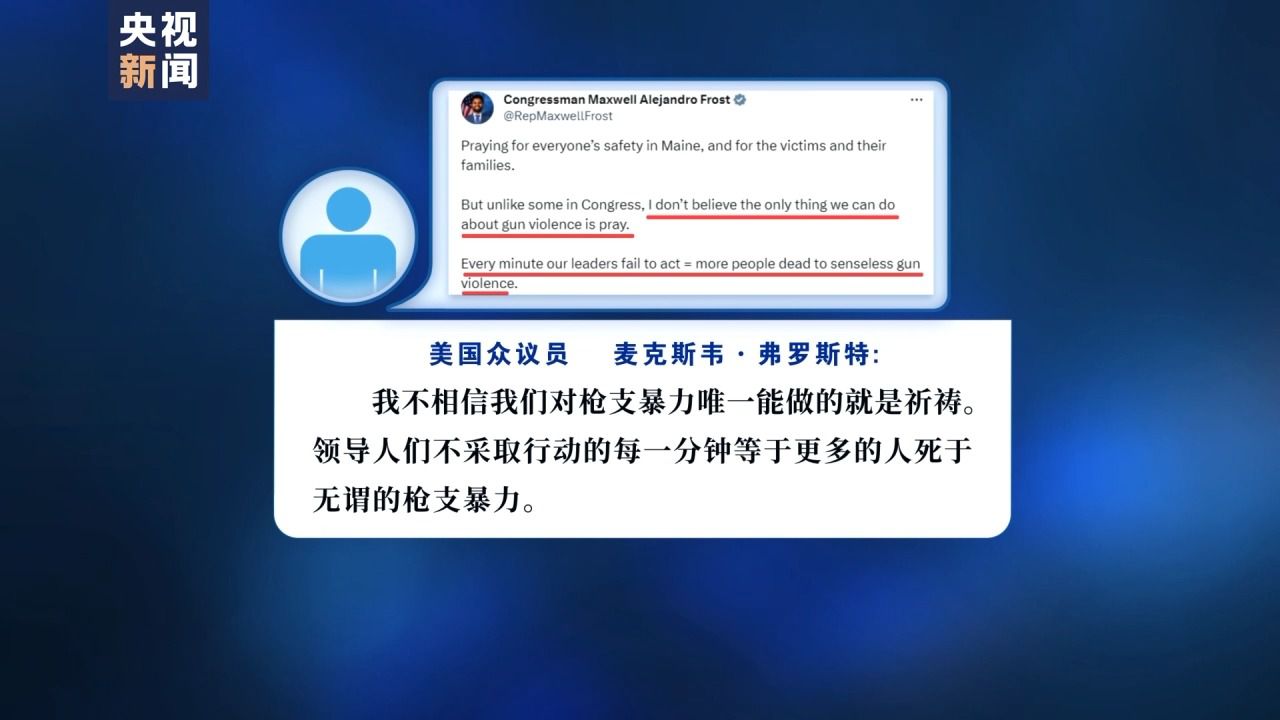 此外,每次槍擊案發(fā)生后,美國擁槍派政客都重復(fù)著空洞的安慰,這次也不例外。在多位擁槍派政客的社交媒體上,各種口頭安慰和無力的陳詞濫調(diào)比比皆是。對(duì)此,美國眾議員麥克斯韋·弗羅斯特(Maxwell Alejandro Frost)發(fā)推文寫道,“我不相信我們對(duì)槍支暴力唯一能做的就是祈禱。領(lǐng)導(dǎo)人們不采取行動(dòng)的每一分鐘等于更多的人死于無謂的槍支暴力?!?/p>