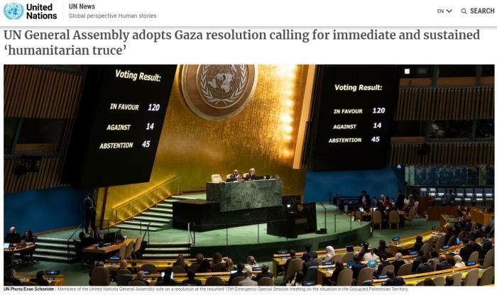 據聯合國網站消息,紐約當地時間27日下午,第78屆聯大以125票贊成、14票反對和45票棄權的表決結果,通過了由約旦代表阿拉伯國家集團提交的一份聯大決議草案。