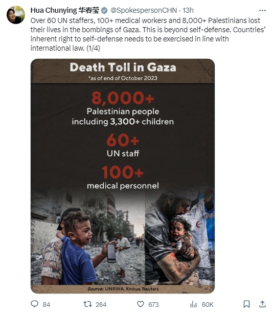 據(jù)報(bào)道,當(dāng)天,華春瑩發(fā)帖提及加沙地帶的人員傷亡。她稱,“超過60名聯(lián)合國工作人員、100名醫(yī)務(wù)工作者、8000名巴勒斯坦人在對加沙的轟炸中喪生。這超出了自衛(wèi)的范圍。各國擁有的自衛(wèi)權(quán)須依據(jù)國際法行使。”