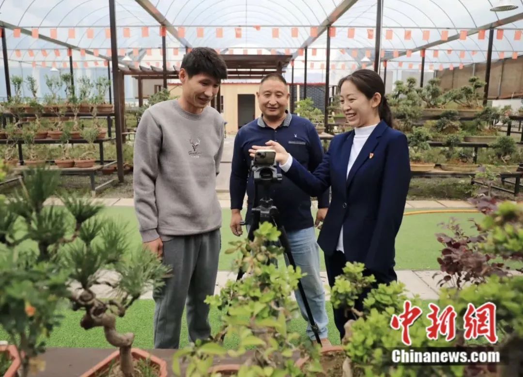 午后,在“中國盆景淘寶第一村”新河鎮(zhèn)周圈村,花農姜愛花忙著給一株刺柏“盛裝打扮”,晚上,這株刺柏會被送往該村的“花木集市”,數十名主播將對其直播競拍。