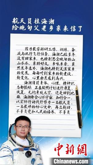 中新網(wǎng)昆明11月5日電(陳靜)記者5日從云南省保山市施甸縣委縣政府獲悉,其收到了航天員桂海潮4日從北京發(fā)來的回信,他在信中表示,感謝家鄉(xiāng)的哺育,期待恢復(fù)后,回家鄉(xiāng)看看!