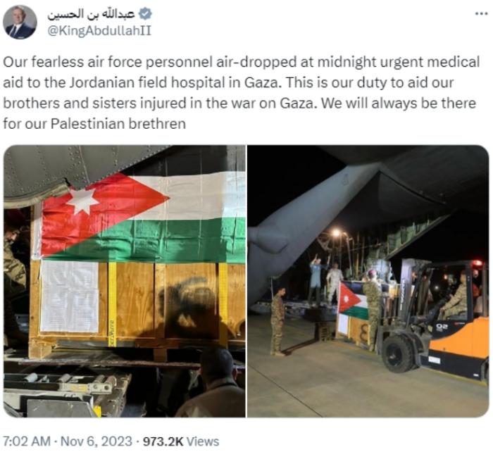 中新網11月6日電 當地時間6日,約旦國王阿卜杜拉二世在社交媒體發(fā)文稱,約旦空軍在6日午夜時分向加沙的約旦野戰(zhàn)醫(yī)院空投了緊急醫(yī)療援助物資。