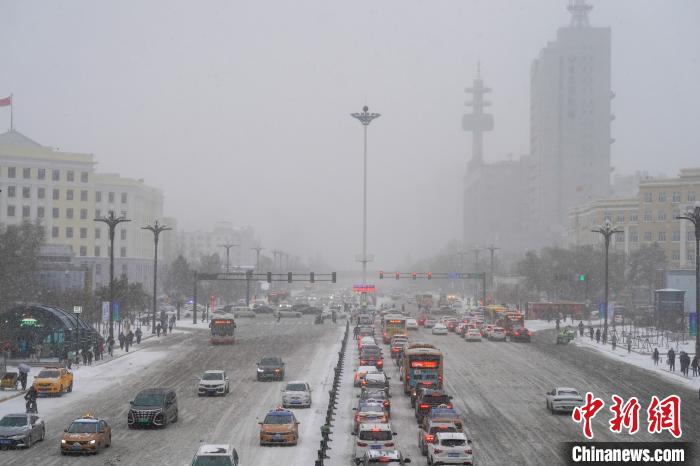 11月6日,哈爾濱市迎來暴雪天氣,車輛在結冰的路面上蝸行。趙宇航 攝