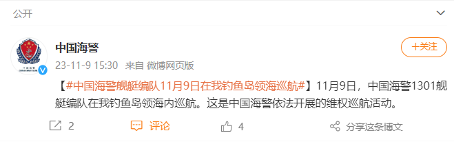 中新網(wǎng)11月9日電 據(jù)中國海警局官方微博消息,11月9日,中國海警1301艦艇編隊在我釣魚島領(lǐng)海內(nèi)巡航。這是中國海警依法開展的維權(quán)巡航活動。