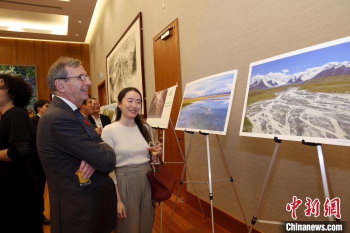 當(dāng)?shù)貢r間11月8日,中國駐加拿大使館舉辦國家公園圖片展暨招待會。圖為與會嘉賓觀看三江源國家公園照片?!≈行律缬浾?余瑞冬 攝