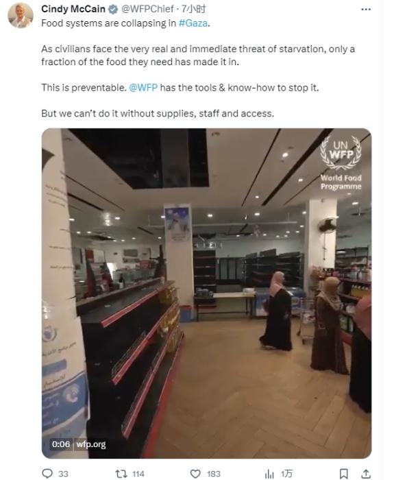 世界糧食計劃署發(fā)文表示,自新一輪沖突開始以來,進(jìn)入加沙的糧食只能滿足該地區(qū)百分之十的需求,加沙地帶現(xiàn)在面臨著巨大的糧食缺口和普遍的饑餓威脅。
