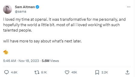 當?shù)貢r間18日,奧特曼在社交平臺表示,“我很喜歡OpenAI的時光,這對我個人來說是變革性的,也希望通過重塑世界帶來一些變革。最重要的是,我喜歡與這些才華橫溢的人一起工作。”