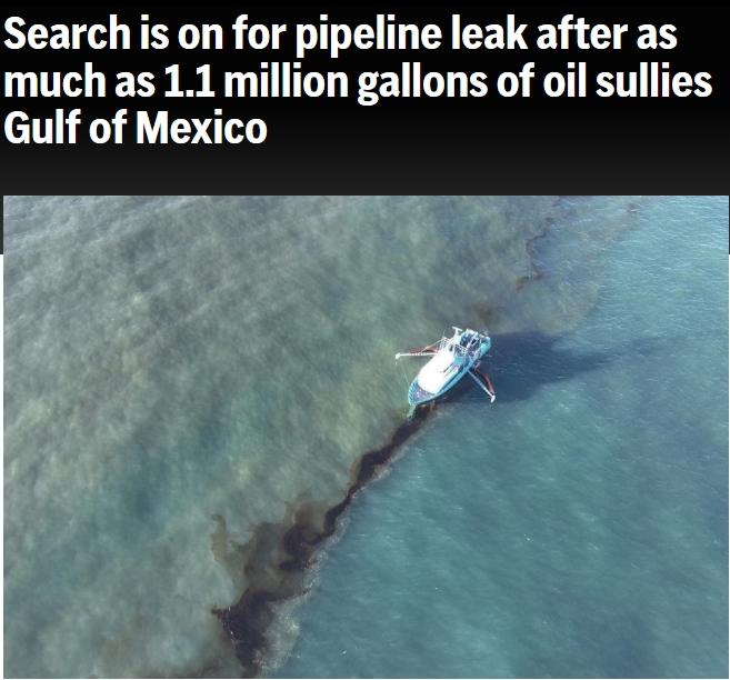 另據(jù)路透社報(bào)道,美國(guó)國(guó)家運(yùn)輸安全委員會(huì)(NTSB)表示,當(dāng)前已派出一個(gè)四人小組進(jìn)行安全調(diào)查,以確定漏油原因。幾個(gè)聯(lián)邦、州和地方機(jī)構(gòu)也在調(diào)查泄漏的來源,美國(guó)海岸警衛(wèi)隊(duì)負(fù)責(zé)領(lǐng)導(dǎo)清理行動(dòng)。