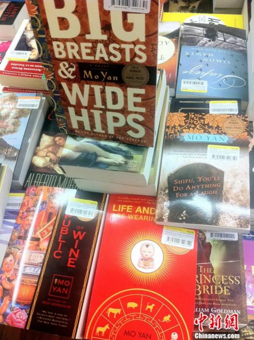 2012年10月21日,莫言的《豐乳肥臀》《酒國》等多部作品英文版正在紐約一家書店上架出售,每本書的封面都印有“2012年諾貝爾文學獎獲得者”字樣。李洋 攝