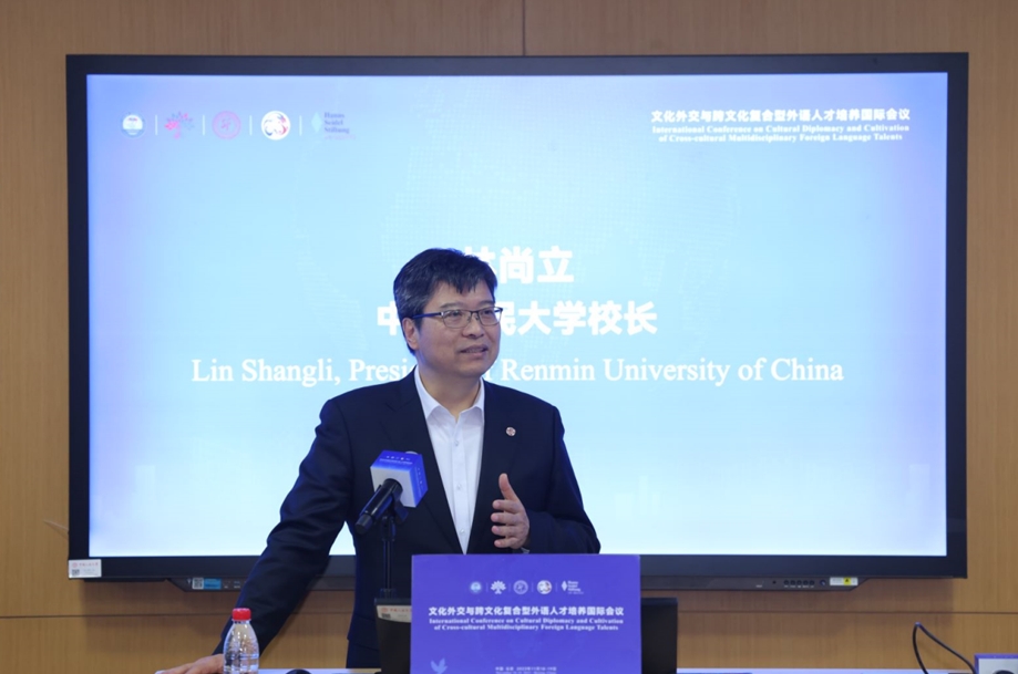 中國人民大學(xué)校長林尚立在會議開幕式致歡迎辭。林尚立表示,文化外交與跨文化復(fù)合型外語人才培養(yǎng)是語言類學(xué)科的必要之舉,此舉對未來人類的發(fā)展會愈發(fā)彰顯其重要性。林尚立認(rèn)為,外語人才的培養(yǎng)應(yīng)該具有文化感、哲學(xué)感,同時要加深對世界文化的了解,要有世界眼光,希望外語專業(yè)能夠培養(yǎng)出一批真正具有家國情懷、人類情懷,同時也具有豐厚人文底蘊的新一代文化人,培養(yǎng)出跨文化的文化外交者、跨文化的文化促進(jìn)者。