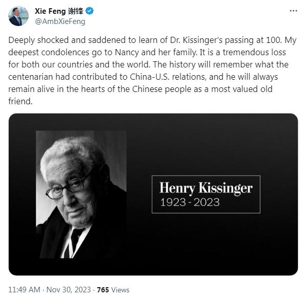 謝鋒寫(xiě)道,“得知基辛格博士去世,享年100歲,我深感震驚和悲痛。我向南希(基辛格夫人)以及她的家人致以最深切的哀悼。這對(duì)我們(中美)兩國(guó)和世界來(lái)說(shuō)都是巨大的損失。歷史將銘記這位百歲老人為中美關(guān)系作出的貢獻(xiàn),他將作為最珍貴的老朋友,永遠(yuǎn)活在中國(guó)人民心中。”