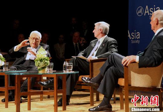 資料圖:美國(guó)前國(guó)務(wù)卿亨利·基辛格(左)與前國(guó)務(wù)卿詹姆斯·貝克等人進(jìn)行有關(guān)美中關(guān)系的對(duì)話。中新社發(fā) 王歡 攝