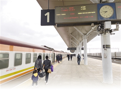 由中國路橋工程有限責任公司承建的蒙內鐵路是肯尼亞獨立以來建設的首條鐵路,也是一條采用中國標準、中國技術、中國裝備建造的現代化鐵路,被譽為中國和肯尼亞共建“一帶一路”標志性工程。圖為蒙內鐵路列車??吭趦攘_畢站。