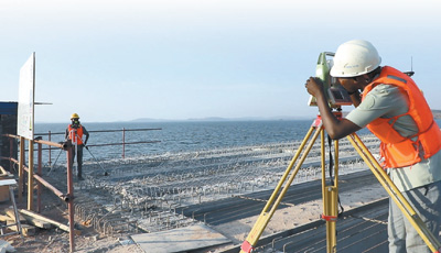 坦桑尼亞馬古富力大橋由中國土木工程集團有限公司和中鐵十五局聯(lián)合承建,連接坦桑尼亞蓋塔省和姆萬扎省,是坦桑尼亞重要的內陸國際通道。大橋建成后將極大改善當地交通狀況,帶動坦桑尼亞與周邊國家的互聯(lián)互通,促進區(qū)域經濟社會發(fā)展。圖為該項目外籍工程師正在使用全站儀進行室外測控。