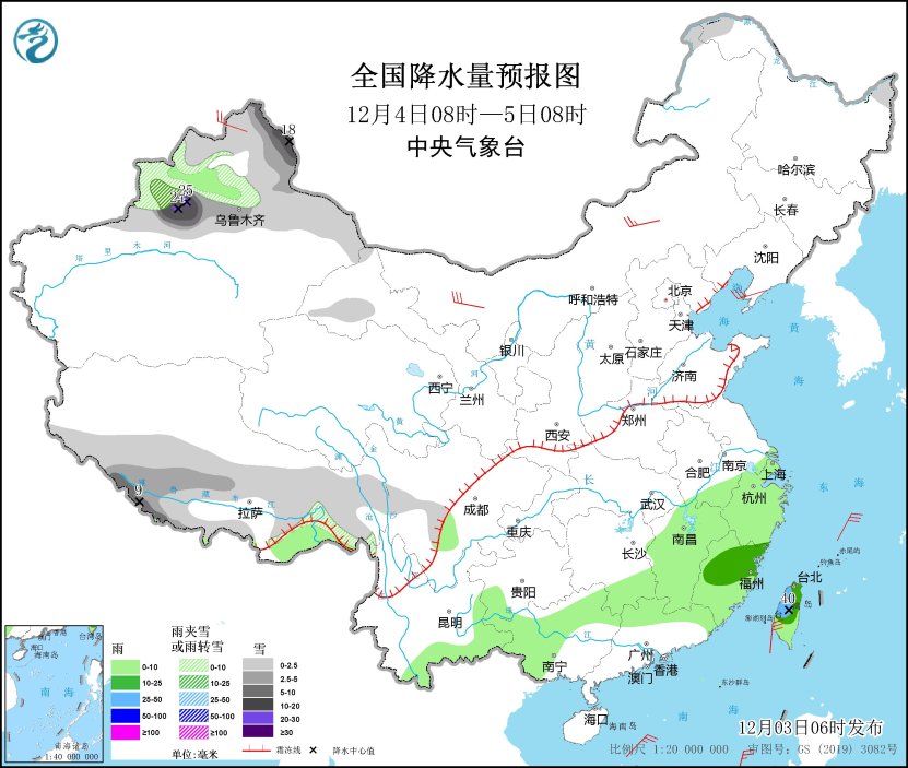 12月4日08時至5日08時,新疆北部、西藏西南部和東部等地部分地區(qū)有小到中雪或雨夾雪,其中,新疆北疆東部和沿天山地區(qū)、西藏西南部等地部分地區(qū)有大到暴雪,局地大暴雪(20~25毫米)。江南大部、云南東部和南部、華南北部和西部、臺灣島等地部分地區(qū)有小到中雨,其中,臺灣島中北部等地部分地區(qū)有大雨(25~40毫米)。內(nèi)蒙古中西部、遼東半島、新疆北部等地部分地區(qū)有4~6級風(fēng)。
