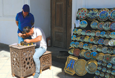 在布哈拉雅克城堡內(nèi),手工藝人正在制作極具當?shù)靥厣氖止に嚻贰?/p>