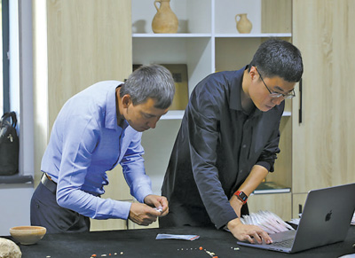 撒馬爾罕考古研究所教授阿爾齊耶夫·科米利翁(左)和中國同事一起整理歸檔出土文物。