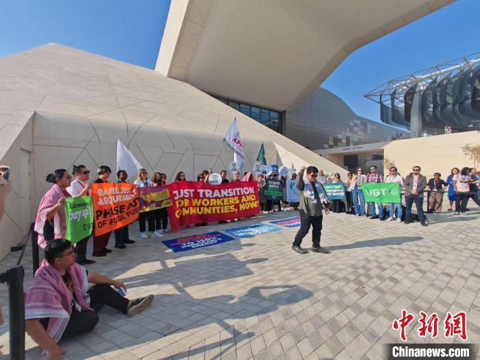 12月9日,阿聯(lián)酋迪拜,抗議者在聯(lián)合國氣候變化迪拜大會(huì)藍(lán)區(qū)會(huì)場集會(huì)并呼吁公正轉(zhuǎn)型。 中新社記者 龐無忌 攝