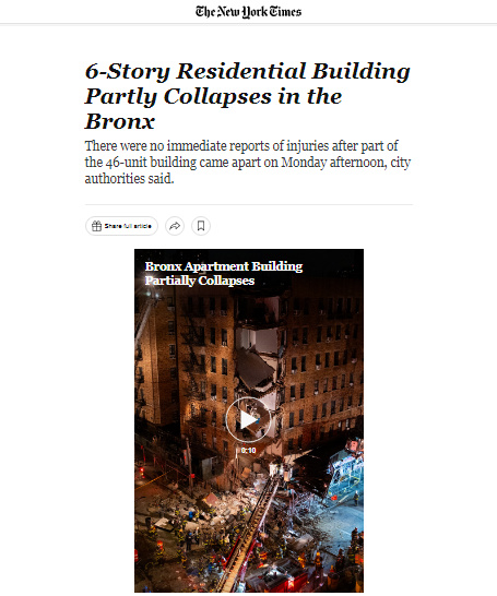 紐約市消防局表示,截至當(dāng)日下午4時30分,還未有人員傷亡報告,并稱此次坍塌事件的調(diào)查尚處于初步階段。