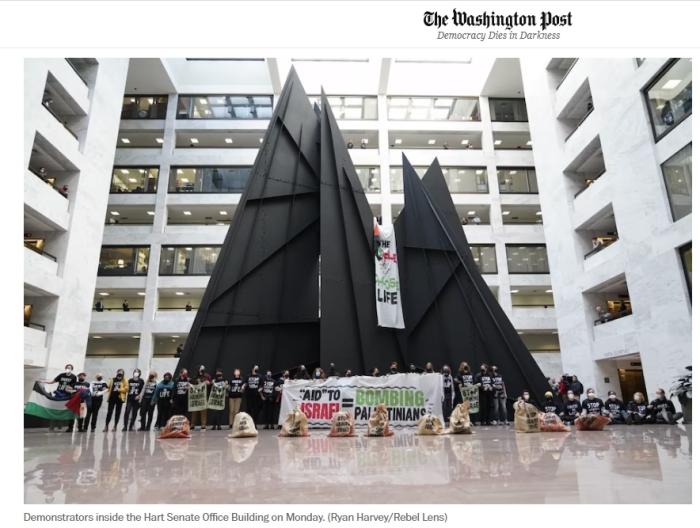 報道稱,抗議者身穿寫有“立即停止(援助)武器”字樣的黑色T恤,高喊“立即停火!立即停火!”。他們還舉著寫有“援助以色列=轟炸巴勒斯坦人”的條幅。