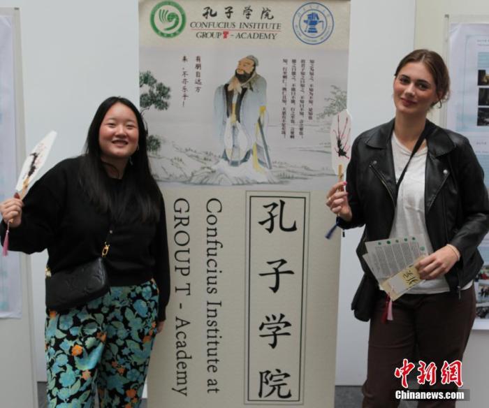 當(dāng)?shù)貢r(shí)間2023年10月19日,比利時(shí)魯汶孔子學(xué)院舉辦“孔子學(xué)院日”活動(dòng),魯汶大學(xué)學(xué)子參與活動(dòng),體驗(yàn)中華文化。圖為兩名青年體驗(yàn)中國(guó)吹墨畫后,揮舞“作品”合影留念。