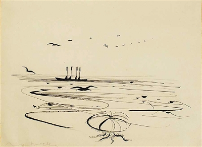 在人物肖像之外,萬(wàn)徒勒里也熱衷于描繪中國(guó)山水。他于1954年創(chuàng)作的《長(zhǎng)江》借鑒了中國(guó)水墨丹青技法,整幅畫(huà)作視野開(kāi)闊,體現(xiàn)出中國(guó)水墨畫(huà)的朦朧、婉約與詩(shī)意。他在客居瑞士期間的畫(huà)作同樣展現(xiàn)中國(guó)水墨畫(huà)開(kāi)闊的構(gòu)圖、精巧的線條和獨(dú)具一格的東方美學(xué)。畫(huà)作《歸來(lái)》通過(guò)南飛的歸雁、孤寥的漁船和茫茫無(wú)盡的海面,讓觀者感受到一種難以訴諸語(yǔ)言、始終縈繞心頭的鄉(xiāng)愁。