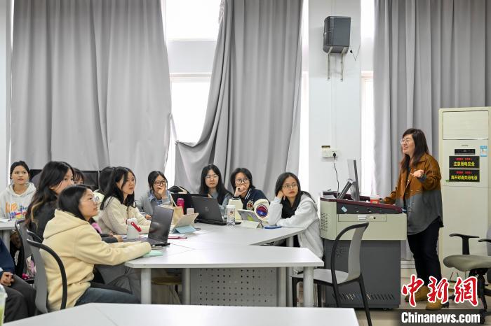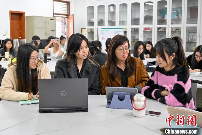 近日,謝雅卉(右一)與同學(xué)們?cè)谡n堂上討論廣告設(shè)計(jì)內(nèi)容。中新社記者 陳驥旻 攝