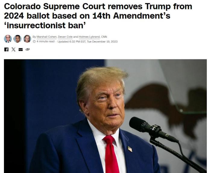 中新網(wǎng)12月20日電 綜合美媒報道,美國科羅拉多州最高法院當(dāng)?shù)貢r間19日裁定,根據(jù)美國憲法第14修正案,鑒于美國國會騷亂事件,將共和黨籍前總統(tǒng)特朗普從該州2024年總統(tǒng)初選的投票中除名,認(rèn)為他沒有資格競選美國總統(tǒng)。