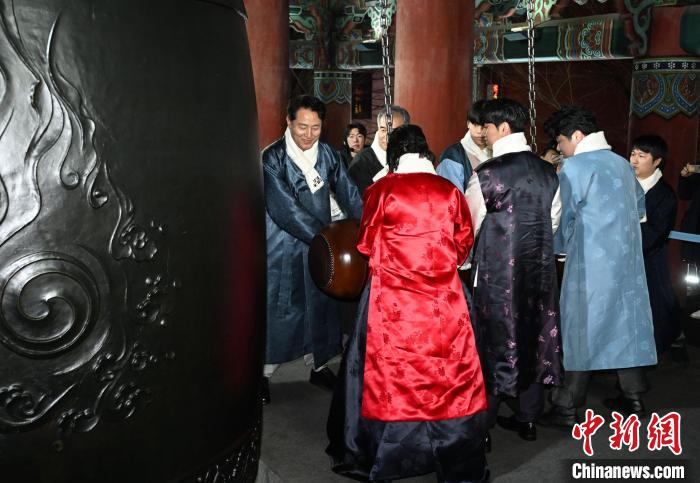 受疫情影響暫停的普信閣新年撞鐘活動時隔4年重新向市民開放。當?shù)貢r間1日0時,首爾市長吳世勛、公開推選出的12名市民代表和6名全球網(wǎng)絡(luò)紅人等22人分為4組撞鐘33次,宣布2024年的到來。