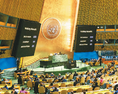 2023年12月12日,聯(lián)合國大會(huì)緊急特別會(huì)議投票通過決議,要求在加沙地帶立即實(shí)現(xiàn)人道主義?;?。圖為會(huì)議投票現(xiàn)場。