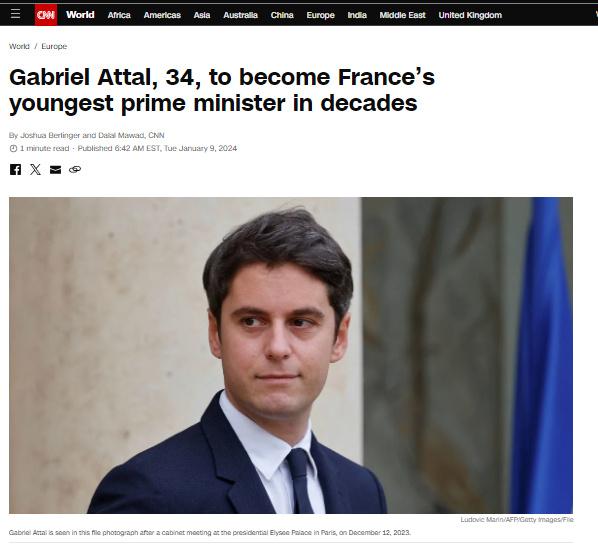 據(jù)報道,現(xiàn)任法國國民教育和青年部長阿塔爾,將成為自1958年法蘭西第五共和國成立以來該國最年輕的總理。