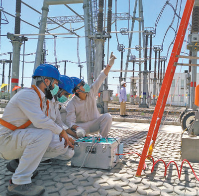 在巴基斯坦默蒂亞里—拉合爾直流輸電項(xiàng)目現(xiàn)場,中巴工程師對設(shè)備開展日常檢修。